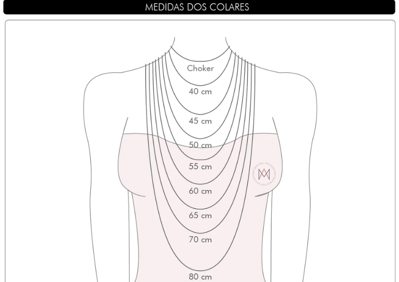 - Colar Choker (35-40 cm): Abraça a base do pescoço, perfeito para looks modernos.
