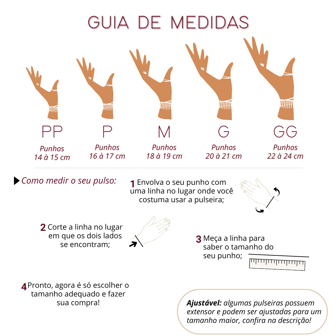 - Pulseira Grande: 20 a 22 cm (para pulsos maiores ou estilo mais solto).